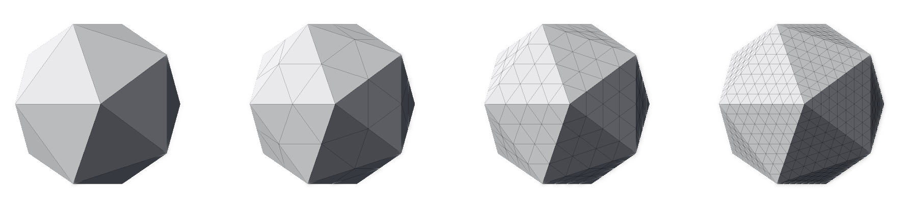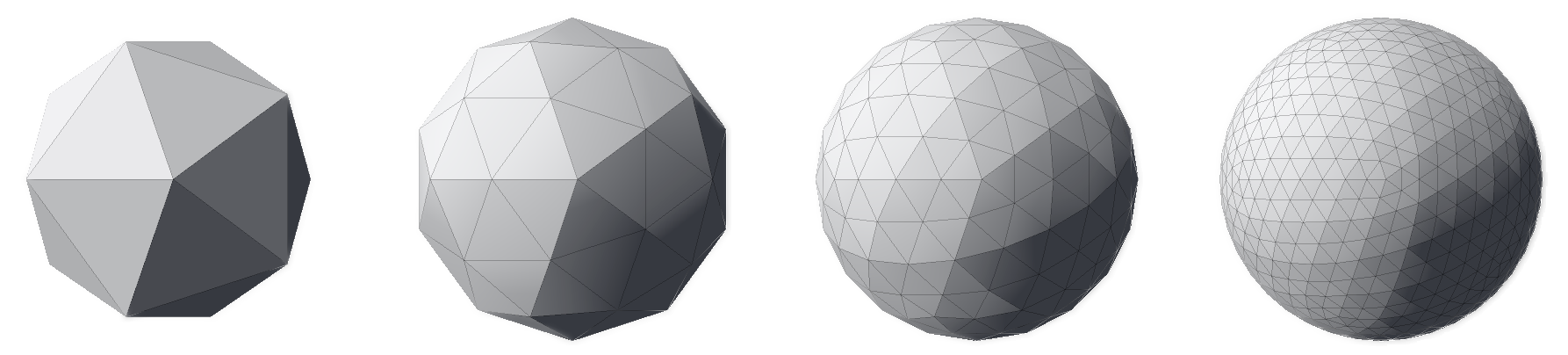 If this approach is used, we end up with meshes like the ones in the image below. Although the number of triangles of each mesh starting from the left-most one increased from 20 to 80, then to 320 and finally to 1280, the shape of the mesh hasn’t changed (if you struggle to see it, look at the contour). The original faces and edges are still untouched—they just have more vertices and triangles now. In other words, the meshes below are all icosahedra; just with different triangle counts.