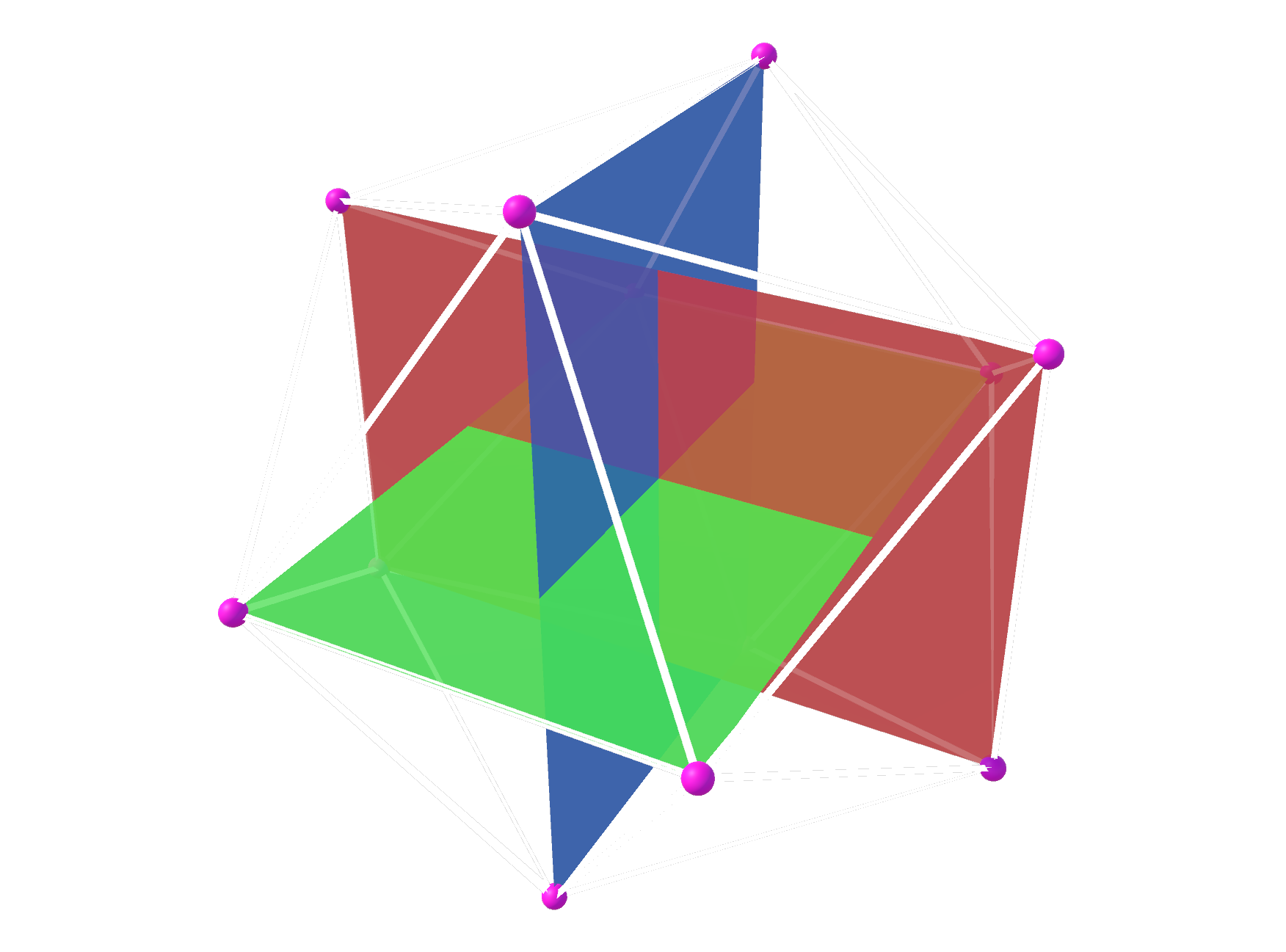 The vertices of the triangles (highlighted with tiny pink balls) will become the vertices of the icosahedron. There are twelve of them, 4 for each rectangle. The white lines define 20 faces and are placed where the icosahedron’s edges would be. Contrast this image with the rotating icosahedron one in the previous section, and the correlation becomes clear.