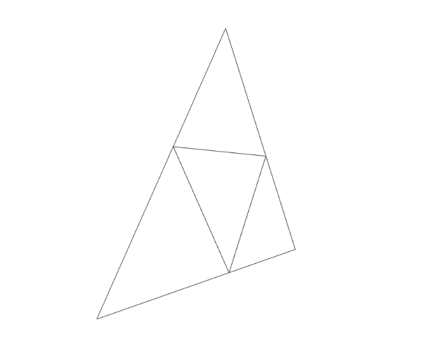 Mesh fragmentation is the process of procedurally increasing the vertex count of a mesh by fragmenting its primitives (in this case triangles) into new, smaller ones. It aims to provide the mesh with more detail than existing. Fragmenting a mesh composed only by triangles consists of turning each triangle into 4 smaller ones. The image below displays an example of a triangle (larger, outer lines) that has been fragmented once into 4 smaller ones. It also happens to unequivocally resemble The Legend of Zelda’s triforce: