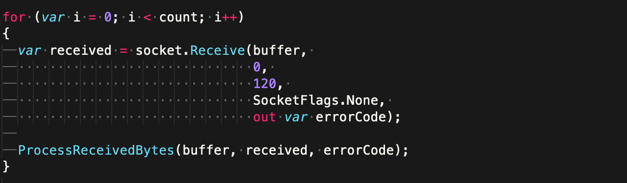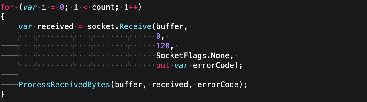The images below demonstrate this practice. Both of them display the same code snippet, which uses tabs for indentation and spaces for alignment. Tabs are visually represented here as straight, horizontal lines, and spaces as white dots. The only difference between the two images is that on the first one, the code editor’s tab width is set to 4 and on the second one, to 2.